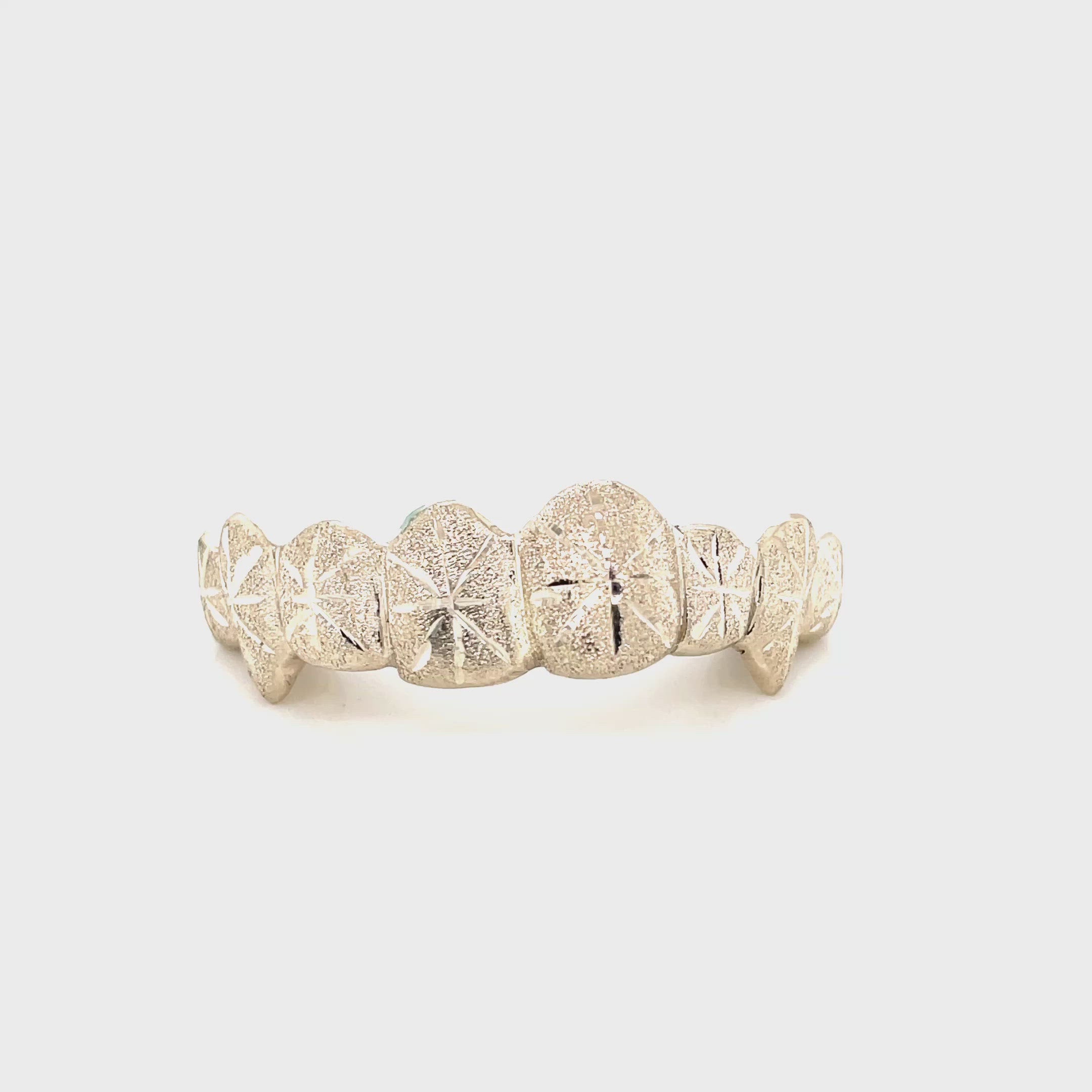 This 8pc White Gold Snowfall Grillz combines diamond dust grillz and sunburst cut grillz to complete one of our shiniest custom grillz styles.