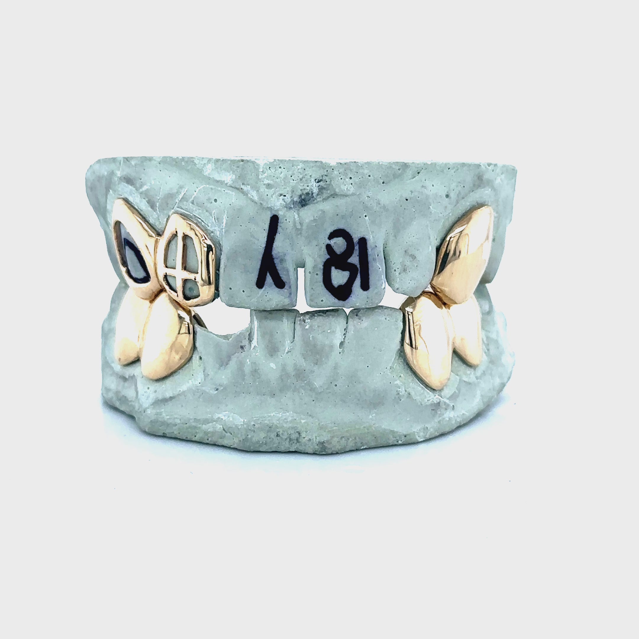 An easy way to add a fierce and daring look to your style, it comes with 3 gold top teeth with on open face fang, and a cross open face incisor on the right side, plus a solid fang on the left. Plus, 4 gold bottom teeth on incisors and fangs to complete your look. Show off your daring attitude today!